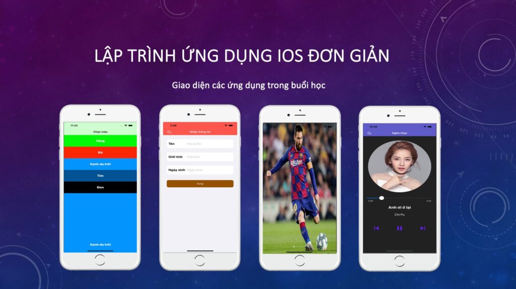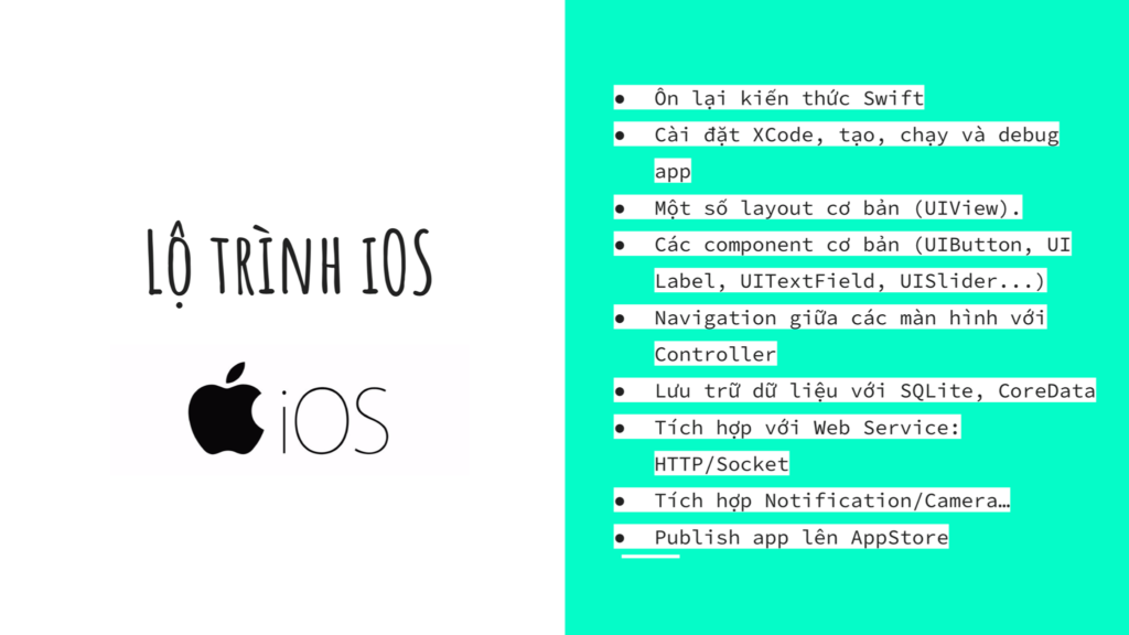 – Lộ trình: học thử Miễn phí lập trình iOS, Swift trong 2 tuần, hướng dẫn làm app iOS đơn giản, hướng dẫn lộ trình học, làm nghề, phát triển, kiếm tiền từ LTV iOS, có thể học tiếp hết cả khoá iOS 21 buổi với học phí ưu đãi.